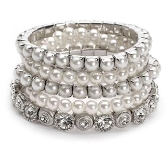 Vintage 5 Strand Pearl ; Rhinestone Bracelet is a perfect gift set for the bride or her bridesmaids. This vintage style bracelet set consists of 5 stands: 2 ivory faux pearl strands, two ivory faux pearl strands with silver plating and a single strand of rhinestones encrusted with an intricate antique silver plating design. This pretty set is tied with a removable tulle bow - for a perfect bridesmaid gift! All five bracelets are stretch bracelets and fit most size wrists. All five bracelets together measure 1 1/4" wide. The pearls are a soft ivory color and will coordinate best with ivory wedding dresses.